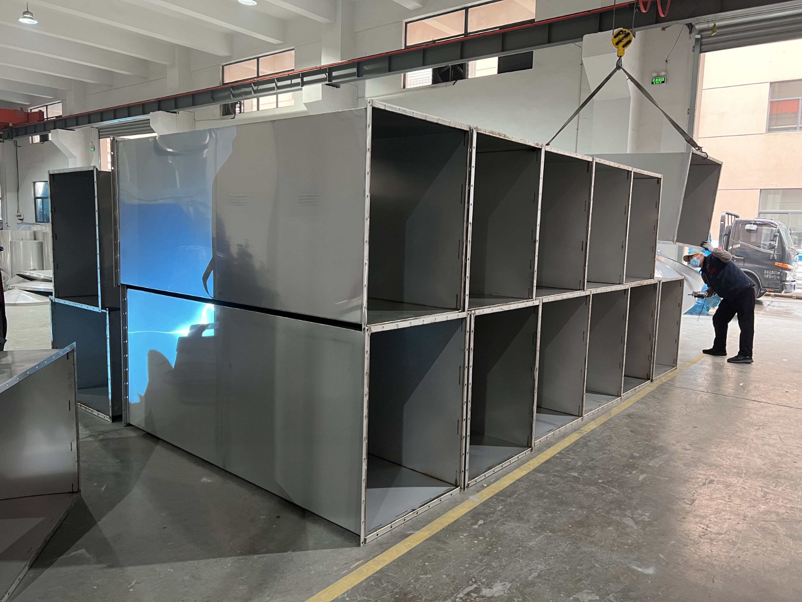 2、下料加工成型 :按照設(shè)計(jì)要求對(duì)不同形狀的不銹鋼板材進(jìn)行下料處理形成所需的風(fēng)道雛形 。這一步可以采用冷裁、熱壓等不同的方式 ;